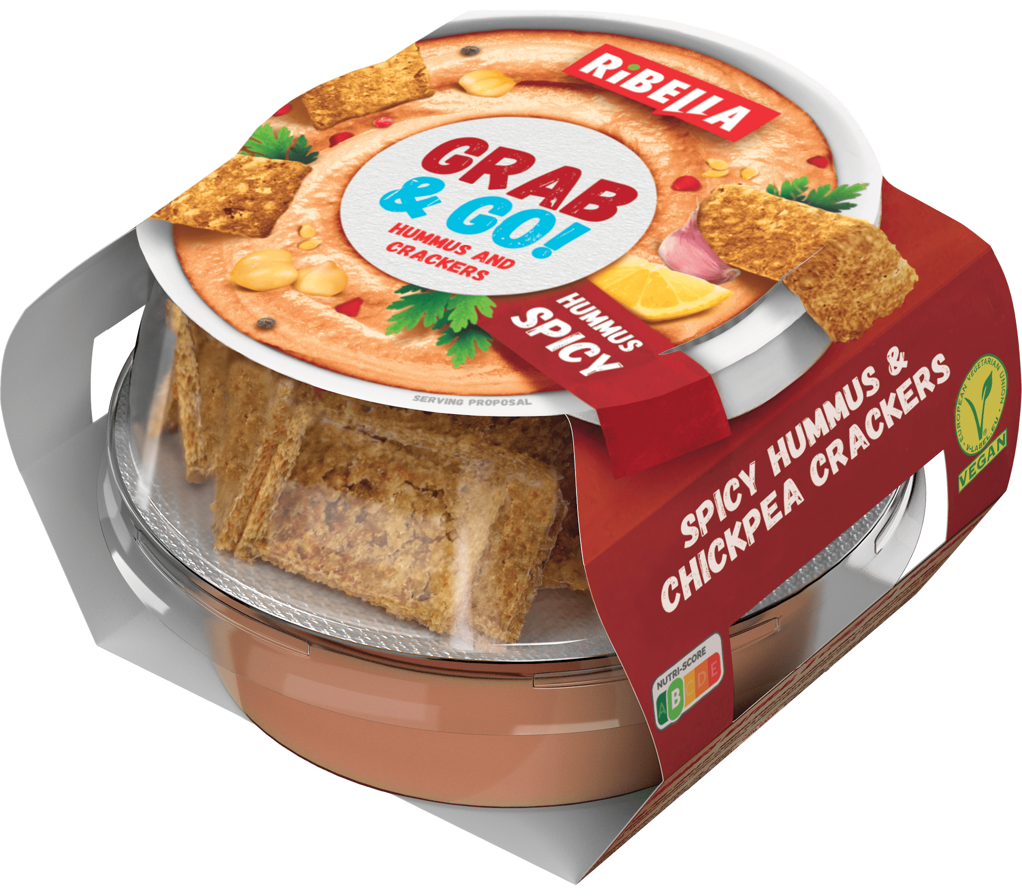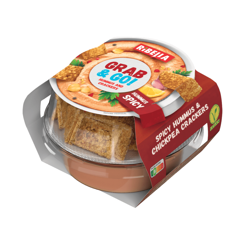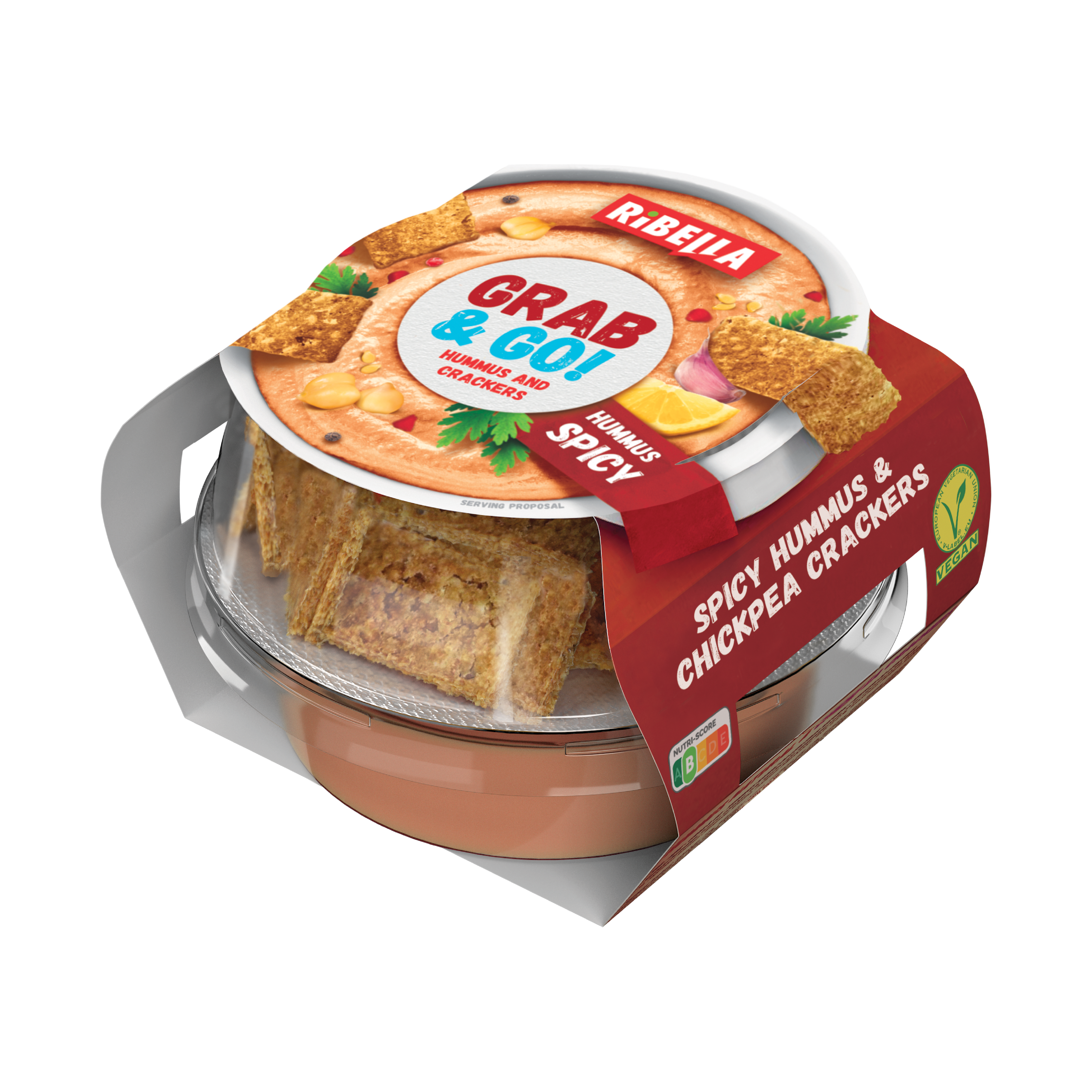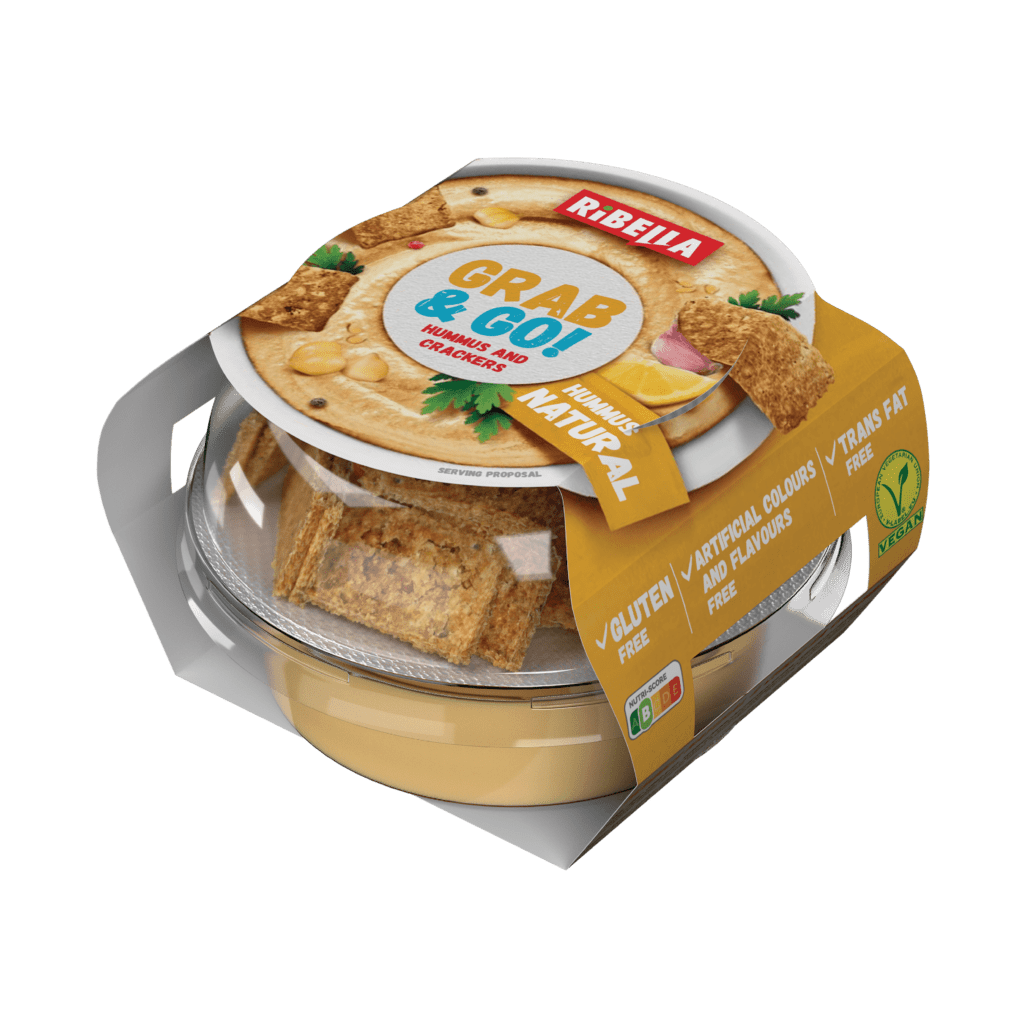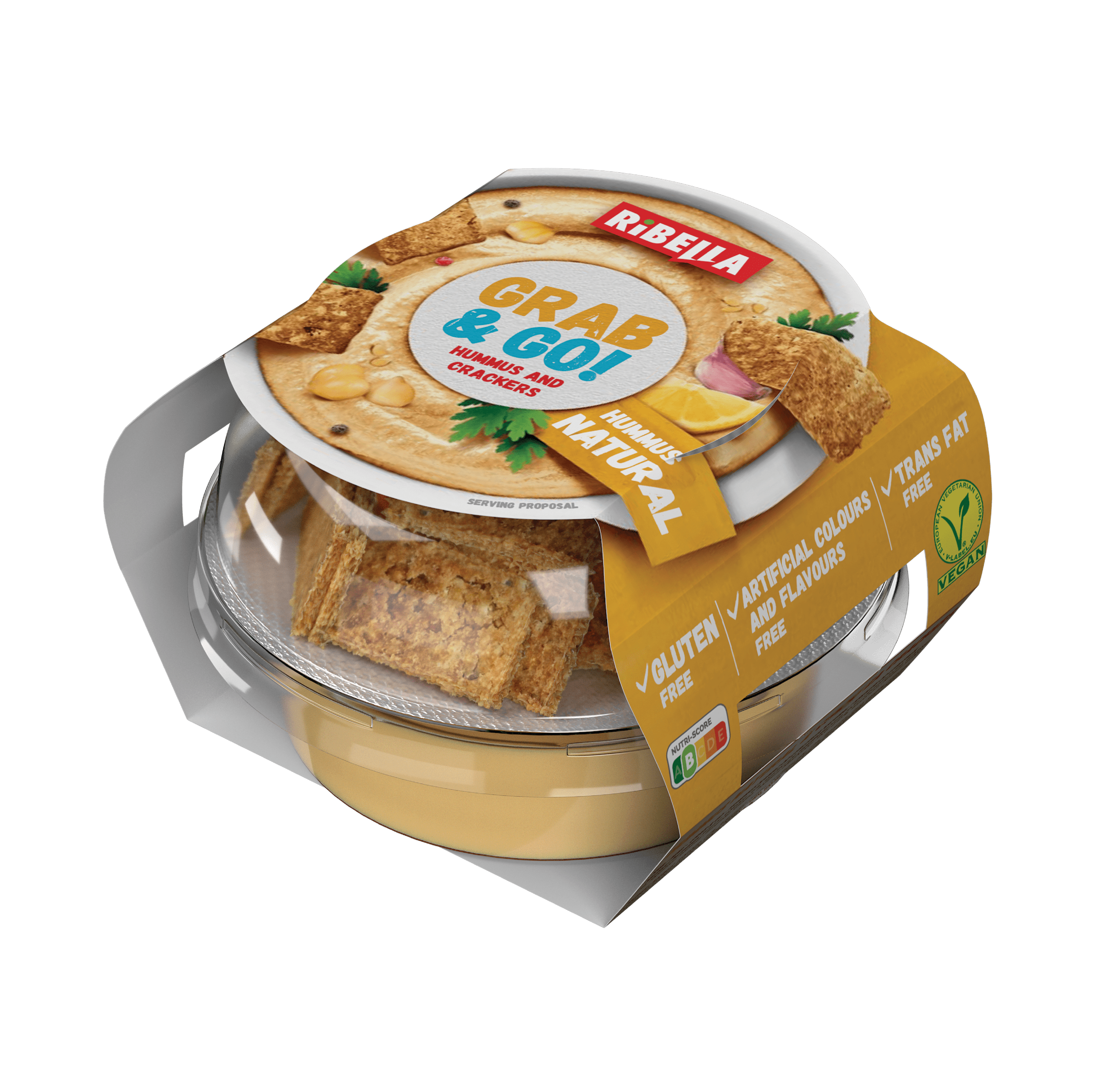 GRAB & GO prihaja v 130g embalaži, v dveh najljubših okusih Hummus Natural in pikant, skupaj s krekerji iz čičerikine moke z dodatkom oljčnega olja, morske soli in zelišč.